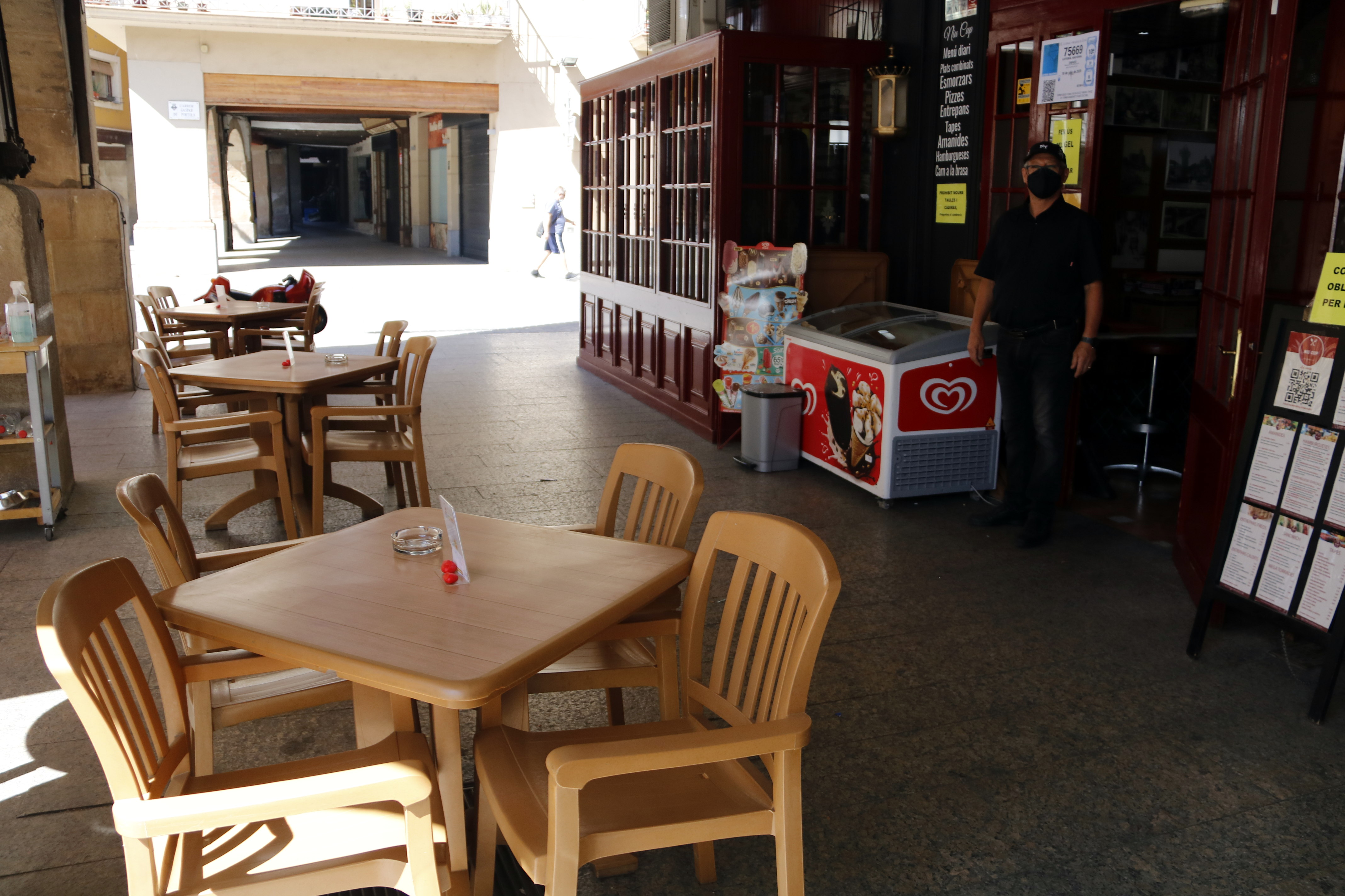 Pla obert on es pot veure en Joaquim Torres, propietari d’un bar de la plaça Mercadal, amb mascareta, al davant del seu establiment, el 17 de juliol de 2020. (Horitzontal)