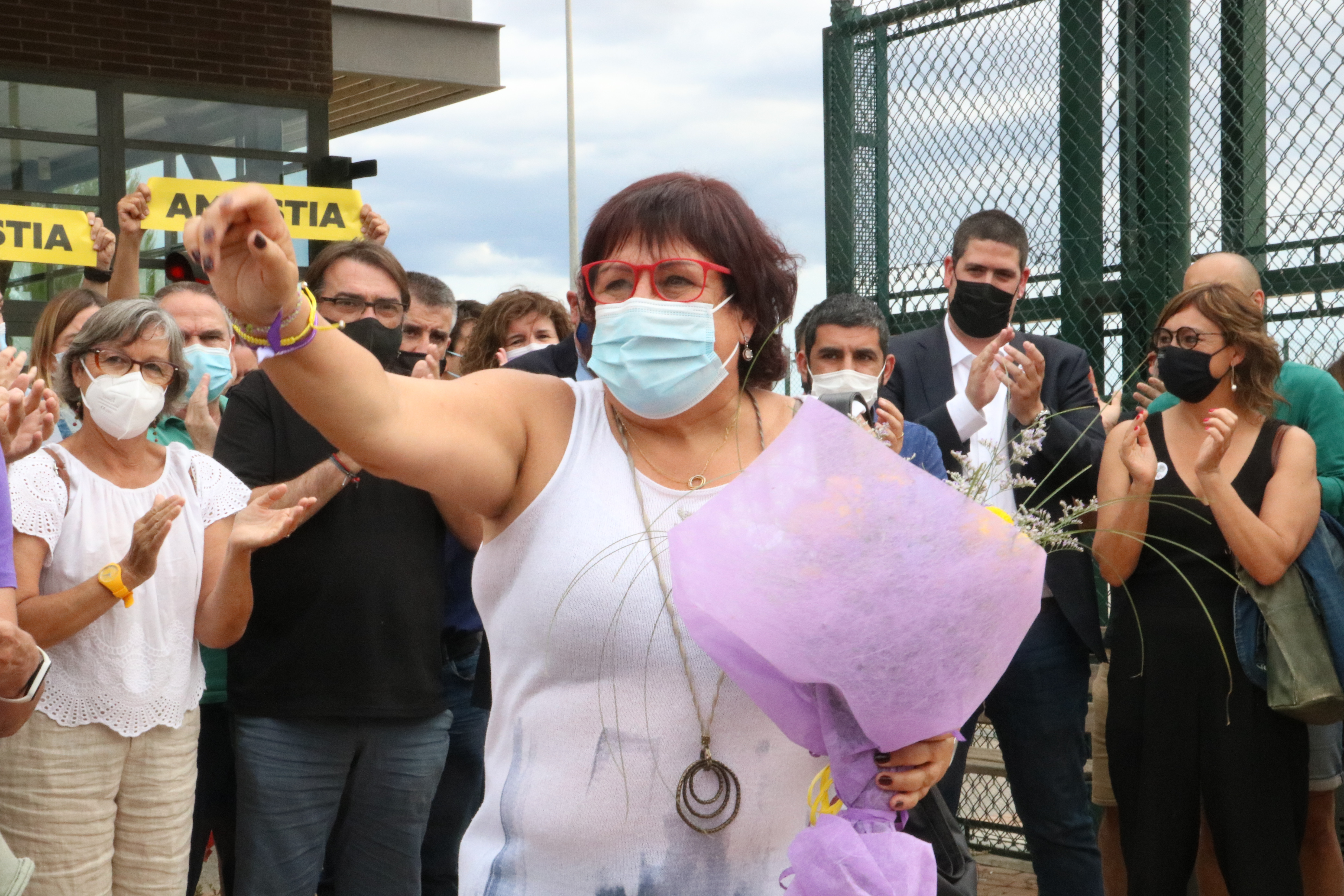- Pla mitjà de Dolors Bassa amb un ram a la sortida de la presó de Figueres. Imatge del 23 de juny del 2021. (Horitzontal)