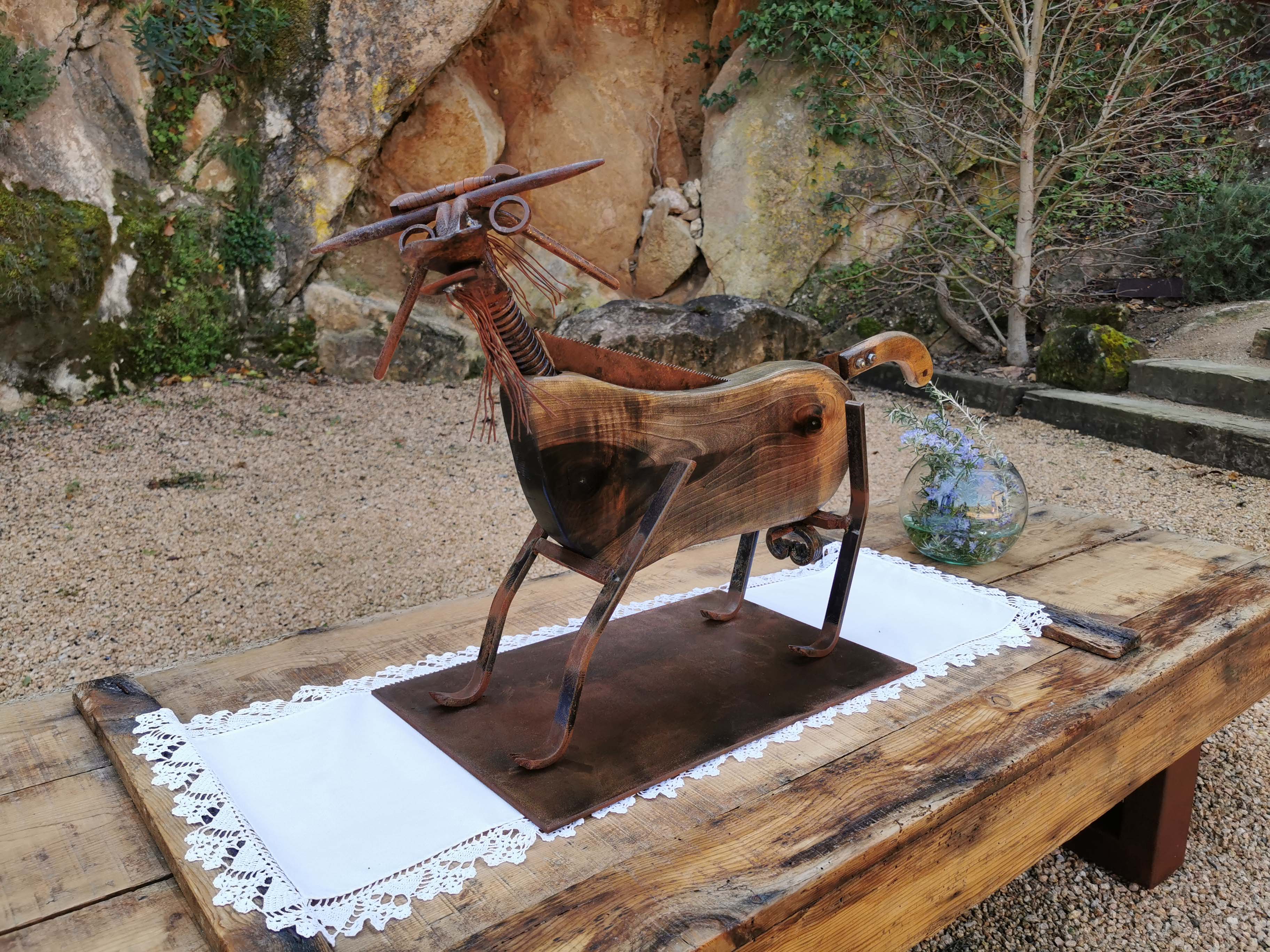És aquest particular embolcall natural el que alimenta la creació de Jordi Marcos. D’una banda, en la seva recerca de materials, ja que rescata de l’oblit ferralla, instruments i eines del camp, maquinària en desús,… qualsevol element pot servir per, a partir del seu disseny original, canviar de forma i donar pas al bec d’un ocell, al cos d’una serp, a les banyes d’una cabra,… Tot serveix i tot és possible, i el resultat és sorprenent, ja que les andròminesil•luminen elements de la fauna autòctona local amb la mateixa naturalitat que Jordi Marcos les treballa al seu taller, ubicat al centre del poble, on exhibeix la seva tècnica exquisida.