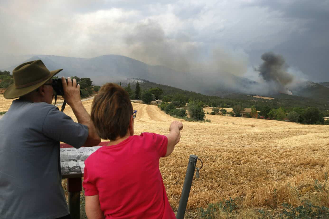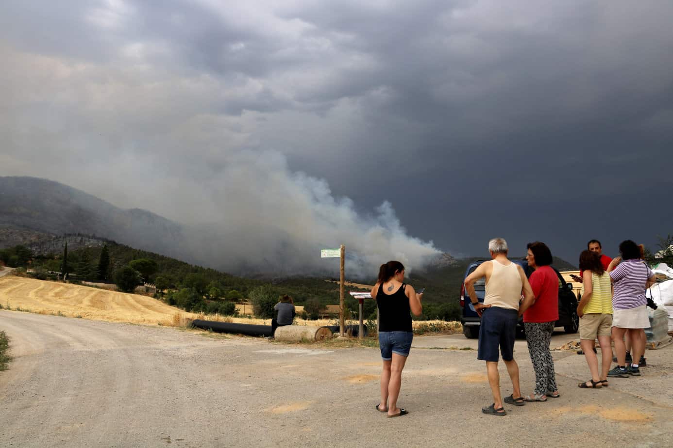 A la zona també treballen pagesos amb tractors, tant al flanc dret com a l’esquerre. Llauren camps per oferir als Bombers diversos llocs on poder aturar l’avenç de les flames. En general, la zona afectada per l’incendi és forestal però envoltada de camps en alguns punts. També hi ha algunes cingleres en què predomina la superfície rocosa.