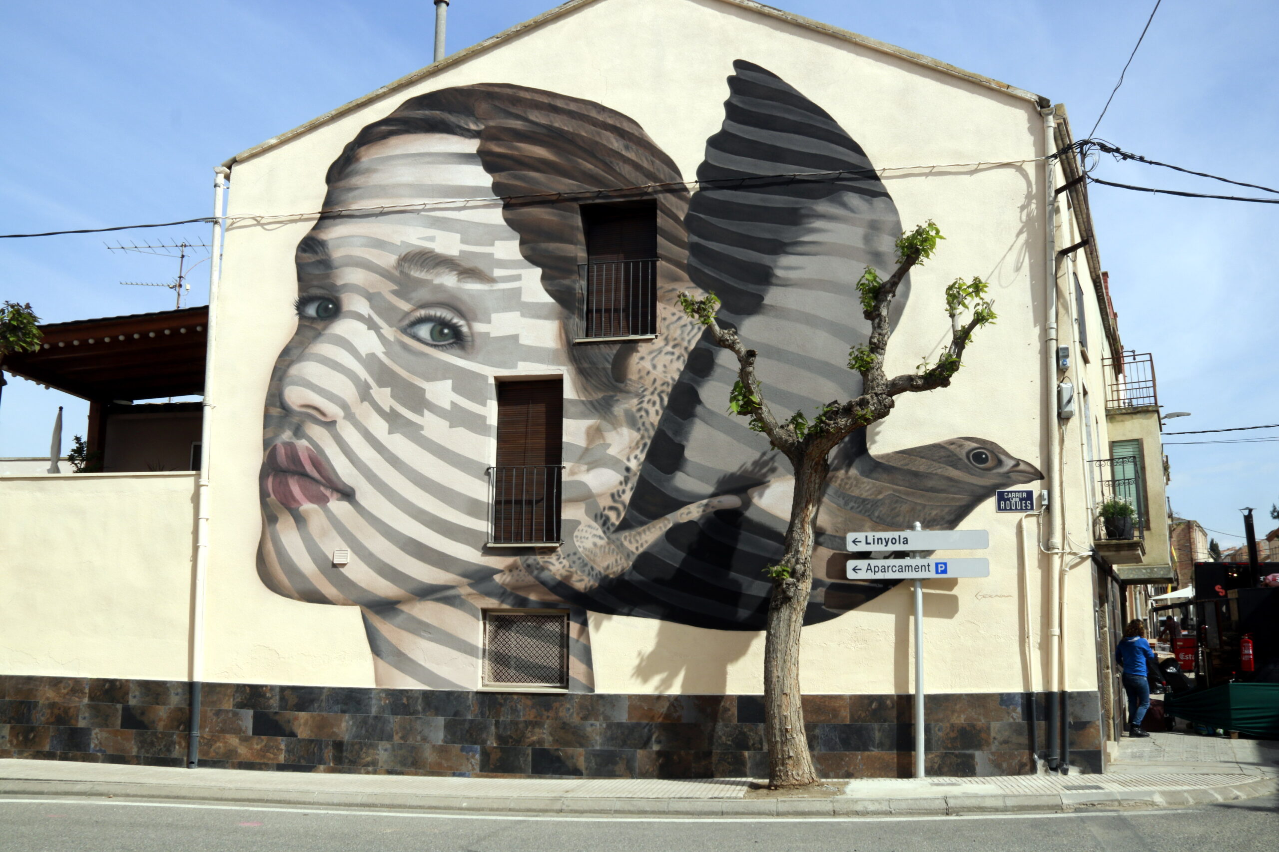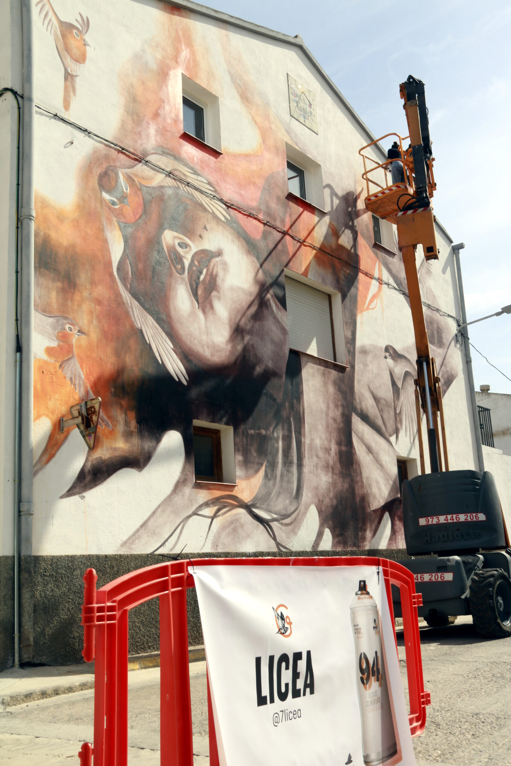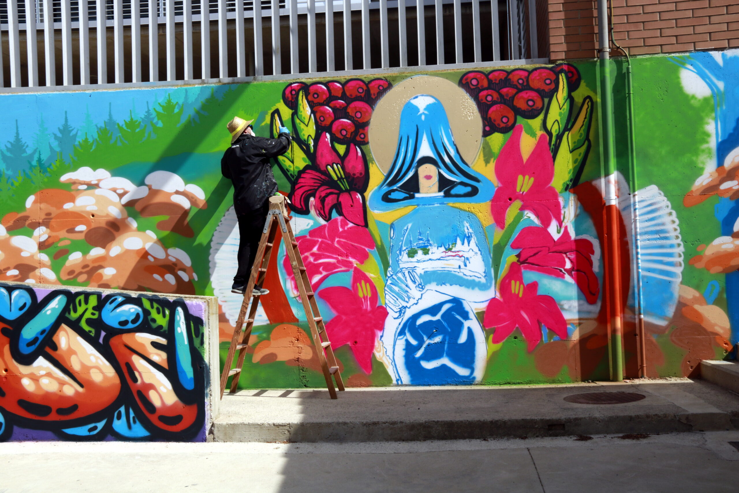 Una de les artistes que participa en aquesta edició és la polaca Nespoon, que ha valorat la bona organització del certamen i el fet que el municipi estigui ple de murals i art. “M’agrada molt aquest festival, és genial”, a més d’afegir que està gaudint força de l’experiència. La muralista està enllestint una obra amb motius florals feta amb pintura blanca sobre un fons marró que s’inspira en el patró d’una mantellina que l’artista va trobar.