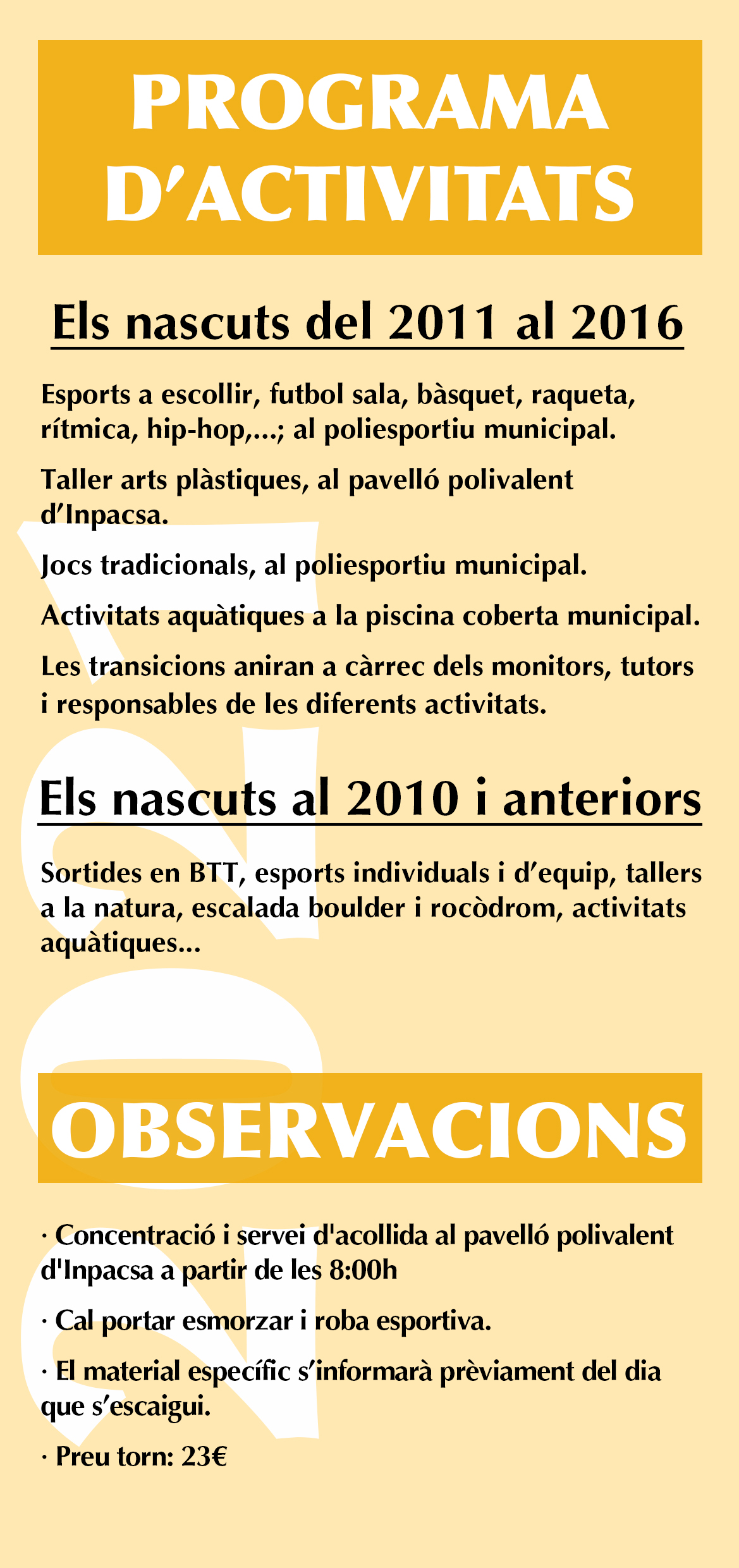 Les activitats es diferenciaran en dos grups, els nascuts del 2011 al 2016 i en segon lloc hi haurà el grup dels més grans, nascuts l’any 2010 i anteriors, en qual es planteja tota una sèrie d’activitats de caire més dinàmic. Les inscripcions es podran formalitzar a la pàgina web de la paeria o a l’administració de la piscina coberta.